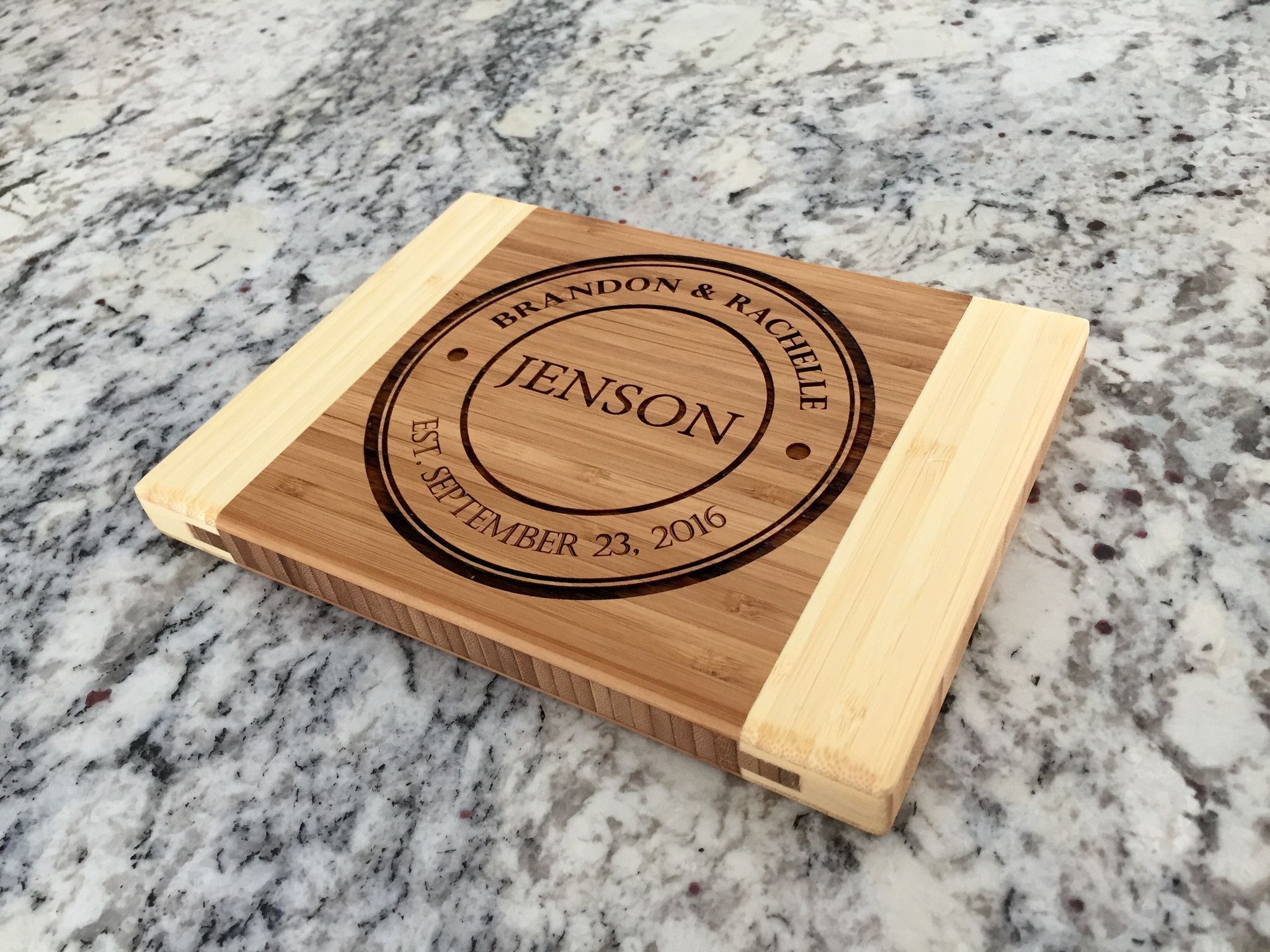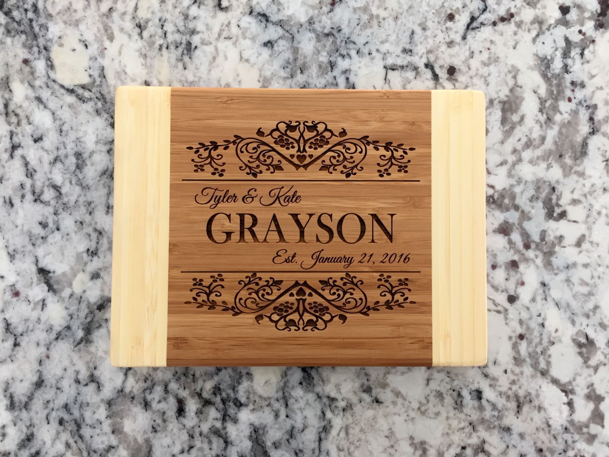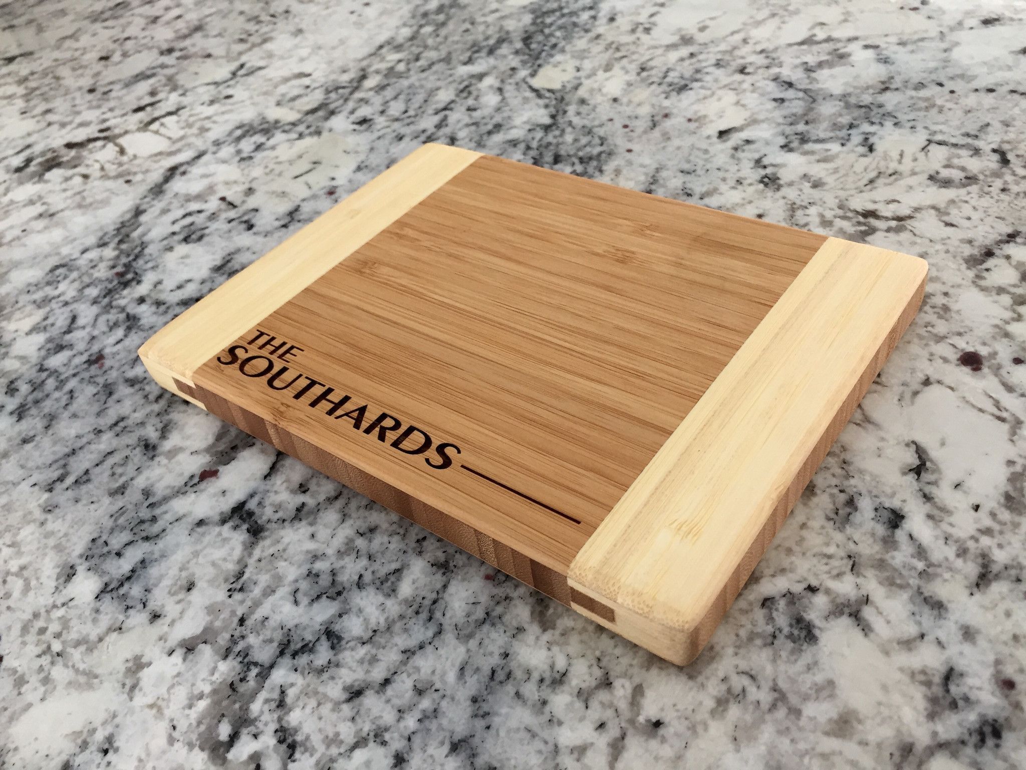 Bamboo cutting boards are environmentally friendly as they come from a replenishable source, and are one of the most durable and best types of wood for cutting boards. One side of the cutting board is personalized for display and the other side is used for food preparation. Board measures 6" x 8" (3/4" thick).
